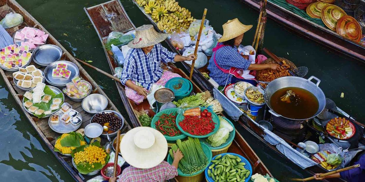 Únicos en el Mundo los mercados Flotante DAMNOEN SADUAK y mercado MAE KLONG que es atravesado por un callejón estrecho por una vía de tren en constante actividad. Sin duda en estos lugares obtendrás fotografías icónicas de tu visita a Tailandia.