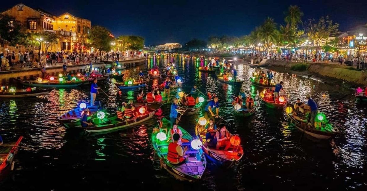 Paseo nocturno en barca por el río Thu Bon para soltar farolillo tradicional. Este bonito acontecimiento solía celebrarse una sola noche al mes, al tiempo se ha vuelto tan popular para los visitantes que practicamente todos los días se puede vivir... la experiencia de una navegación nocturna en canoa con iluminaciones coloridas.